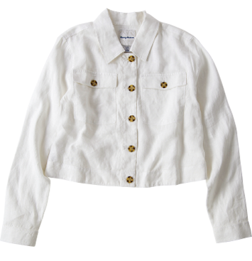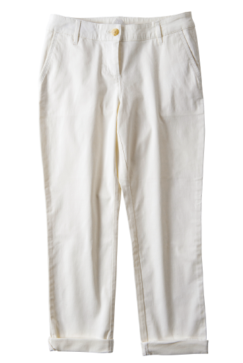 ストレッチのきいた白パンツで、動きやすさ◎。普段使いはもちろん、アクティブなアウトドアシーンでも快適に過ごせます。