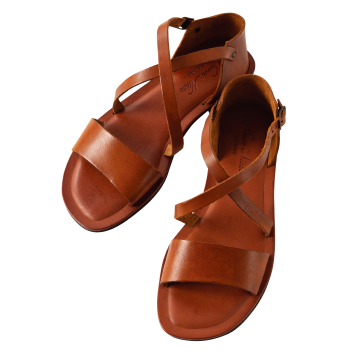 甲でストラップをクロスさせたフラットタイプのサンダル。ラフな印象を抑えた、エレガントな仕上がり。