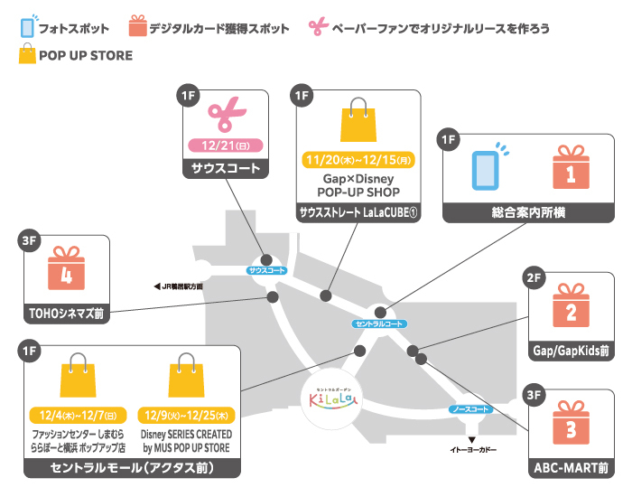 ラリー地点:①総合案内所横、②Gap/GapKids前、③ABC-MART前、③TOHOシネマズ前