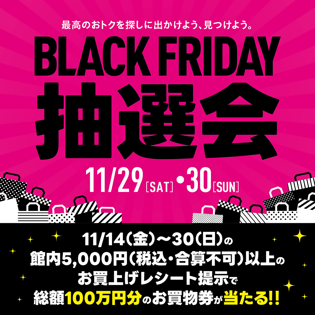 11/14(金)~11/30(日)のららぽーとBLACK FRIDAY期間中、ららぽーと横浜館内店舗にて5,000円以上(税込・合算不可)お買い上げいただいたレシートをご提示で総額100万円分のお買物券が当たるBLACK FRIDAY抽選会を11/29(土)・30(日)に開催✨