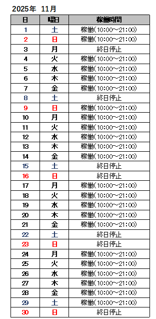 セントラルガーデンのポップジェットにつきまして、11月の最新の稼働スケジュールは上記の通りです。