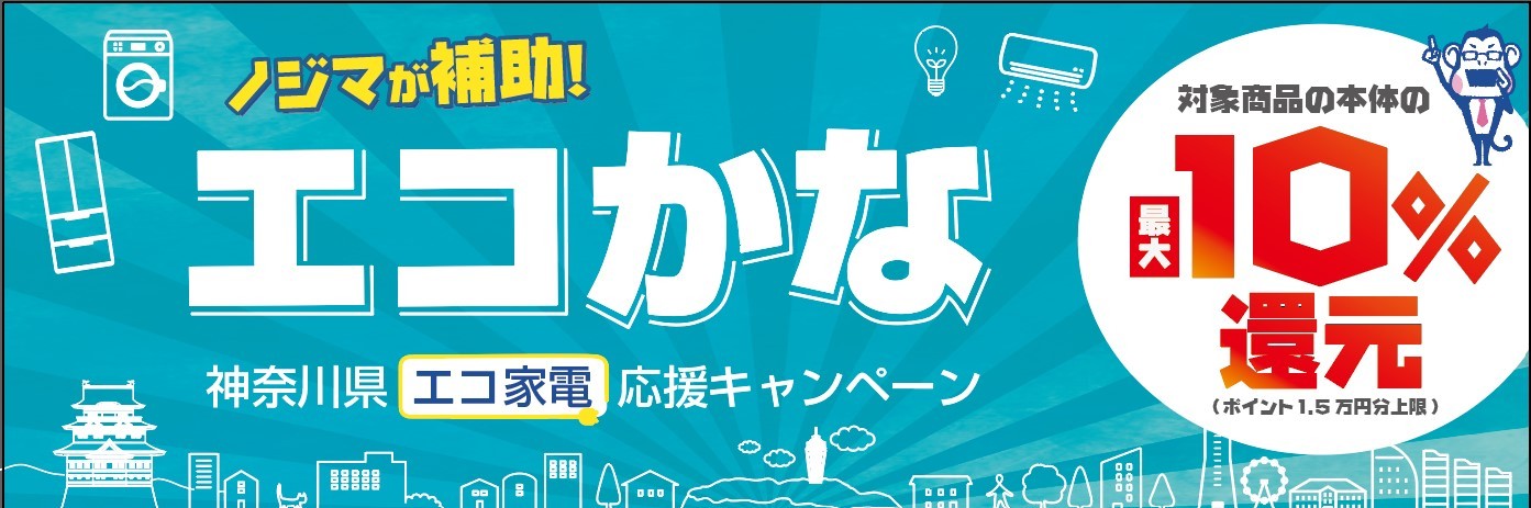 期間中、神奈川県内ノジマ店舗において、対象の省エネ・節水製品をご購入のお客様に、1台あたり最大10%還元(上限1万5千円分)のノジマポイントを付与いたします。