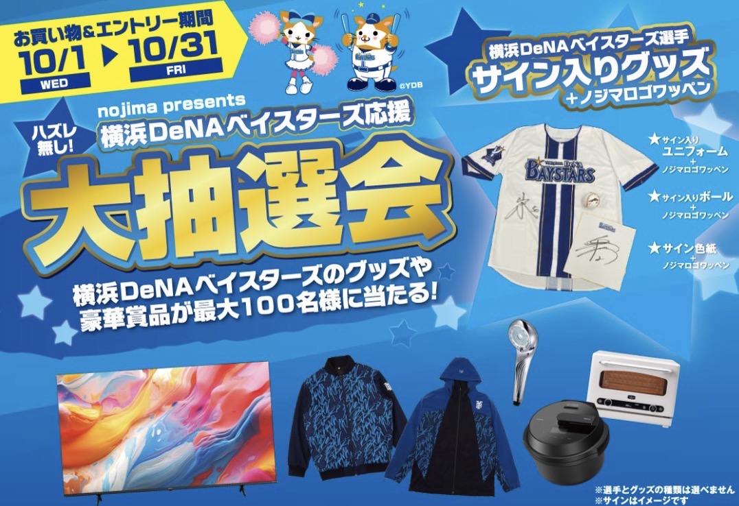 他にもベイスターズグッズや白物家電が当たるお得な大抽選会(詳細は下記)や、「46(シロ)」に関わる白星特価をご用意しております。