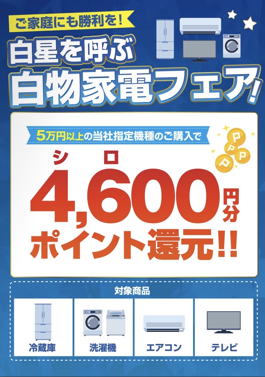 ・内容:5万以上指定機種のご購入でノジマポイント4,600(シロ)ポイント還元