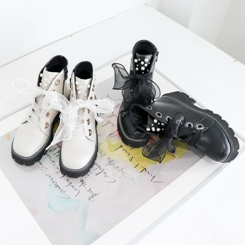 ふわっと軽やかなチュールリボンに、パールとビジューがきらめく華やかなショートブーツ。