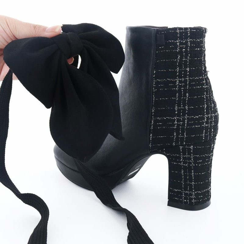 バックスタイルに大きなリボンをあしらった、華やかなショートブーツ。