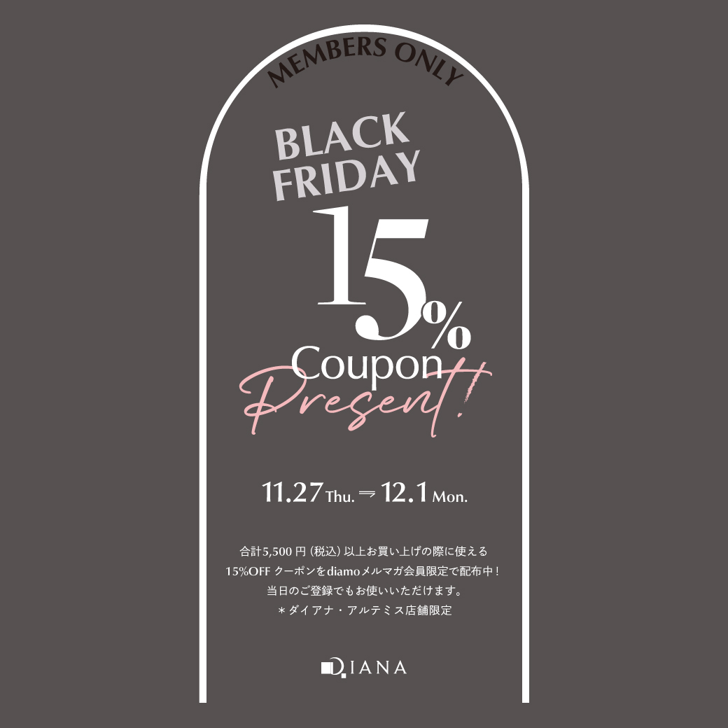 11月27日(木)~12月1日(月)までの5日間、DIAMO会員様限定で税込5,500円以上のお買い上げでご利用頂ける、15%OFFクーポンを配布致します♫