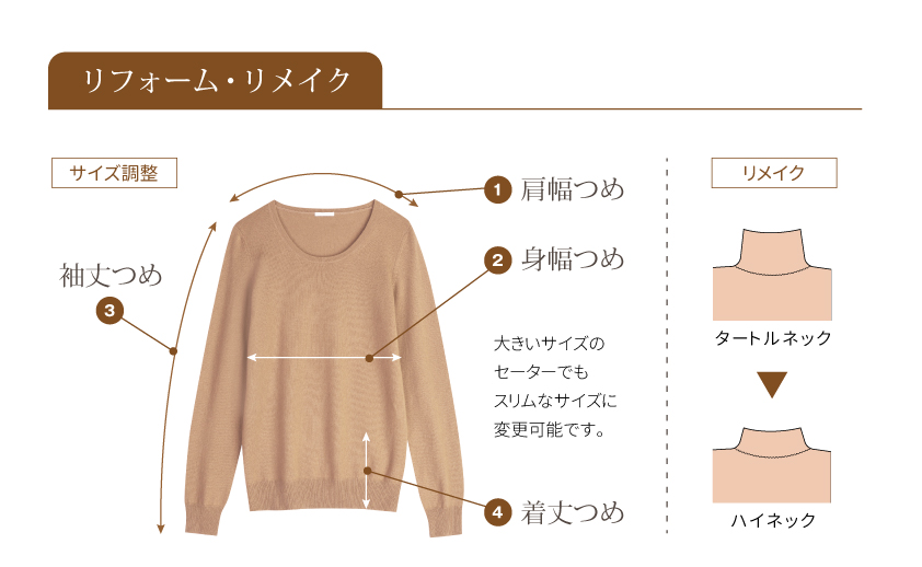 - ニット製品も「袖丈つめ」や「着丈つめ」など、サイズ調整ができます。