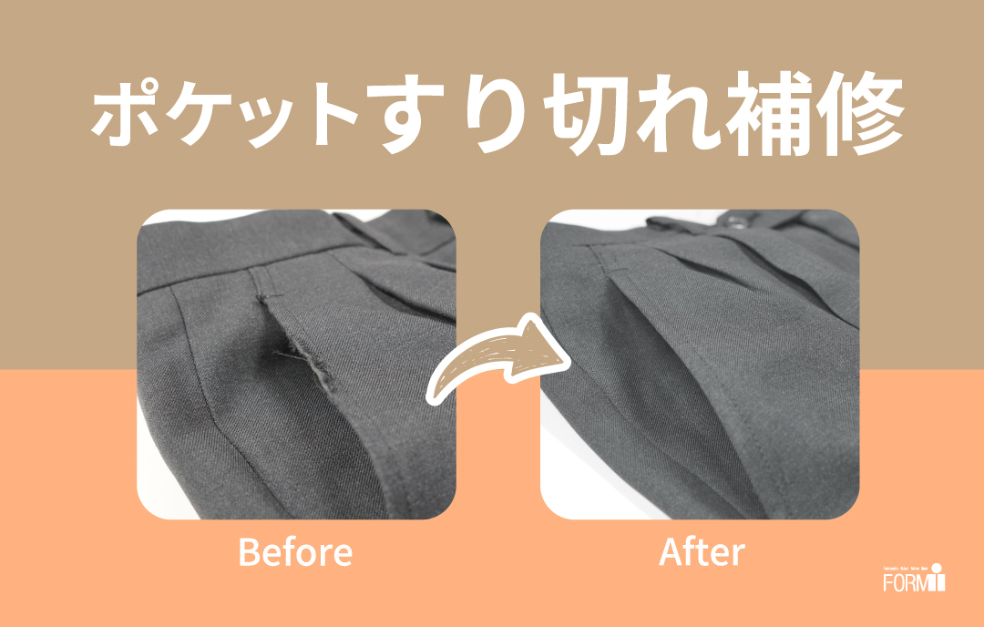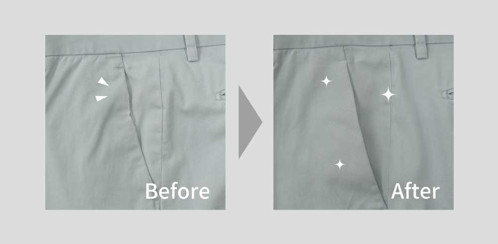 財布やハンカチ、小銭などの出し入れで傷みやすいポケット周りは日常生活でも自然と摩耗しますが、利き手側が傷んでくることがほとんどです。お手持ちのパンツは大丈夫ですか?