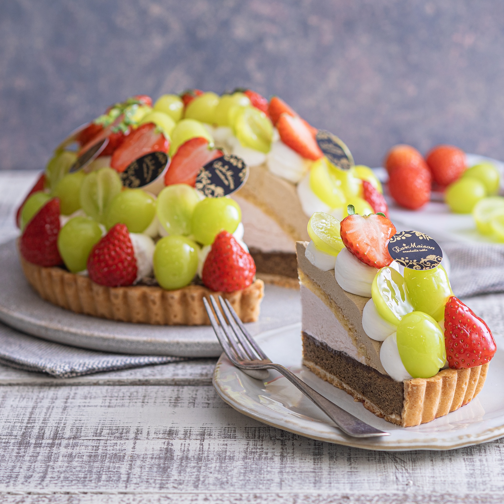 ダージリンティータルトに甘酸っぱいいちごクリームと紅茶クリームを重ね、ピーチアプリコットジャムをしのばせました。紅茶の香りと甘さたっぷりのシャインマスカットをお楽しみいただける限定タルトです。