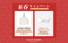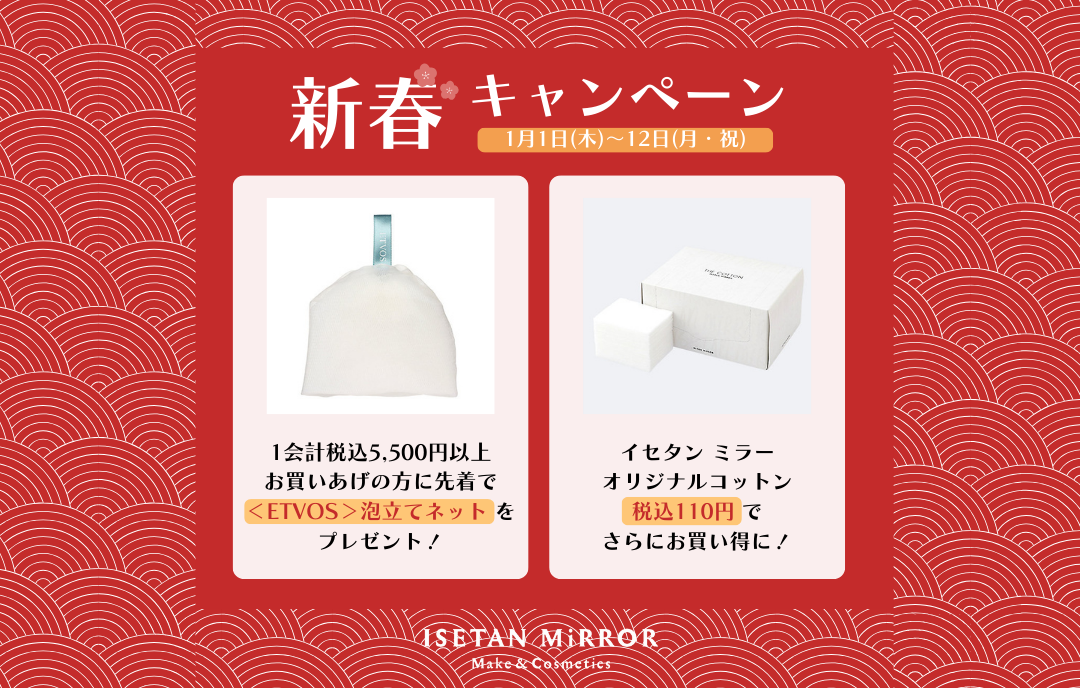 1月1日(木)~12(月・祝)の期間中、三越伊勢丹アプリにてイセタン ミラーをお気に入り店舗選択・該当クーポンをご呈示の上、一回のお会計で税込合計5,500円以上お買いあげのお客さまに先着で<ETVOS>泡立てネットを差し上げます。