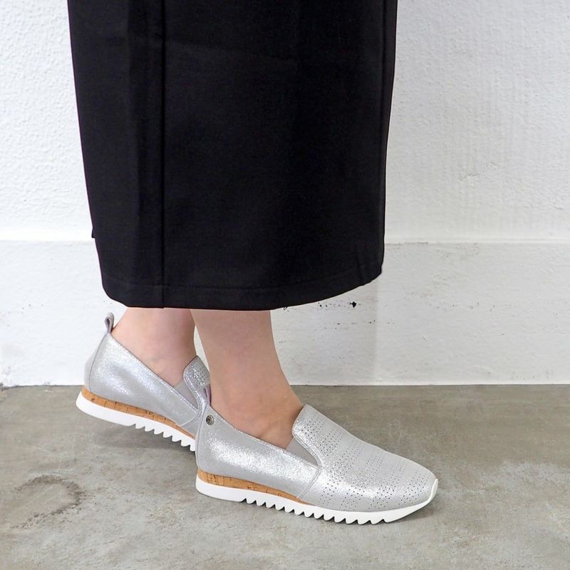 パンチングディテールとホワイトソールが足もとに軽快なリズムを与え、 サイドにはコルク巻きのアクセント。見た目にもこなれ感が漂います。