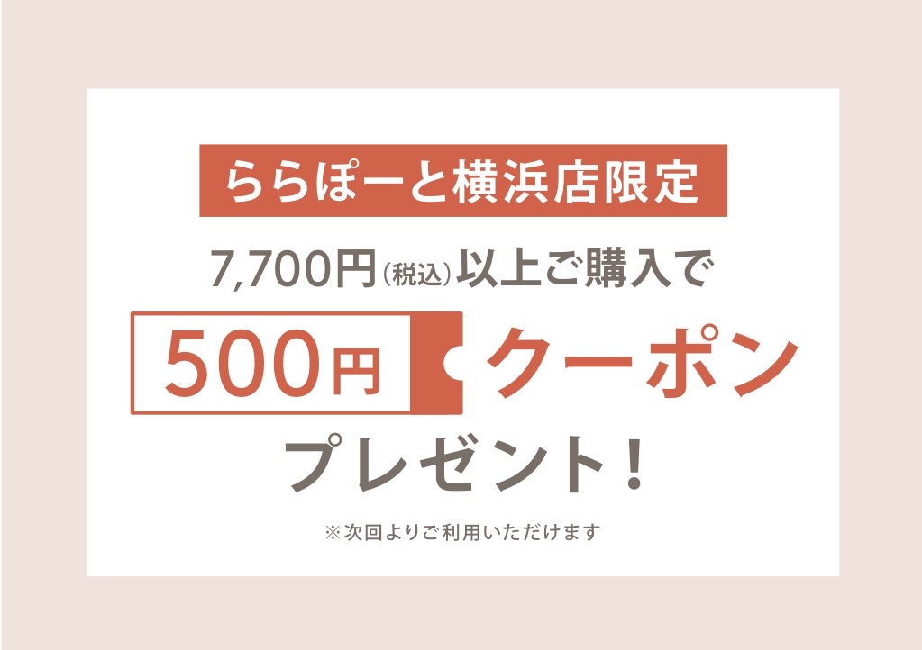 アモスタイルららぽーと横浜店では、7700円(税込)以上お買い求めいただいたお客様には、次回から使える500円オフのクーポン券を配布いたします!
