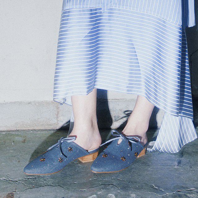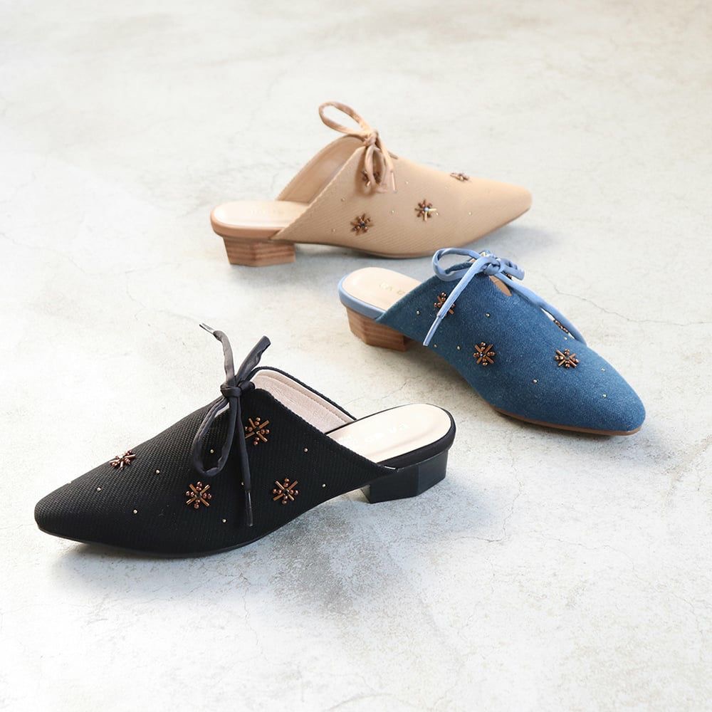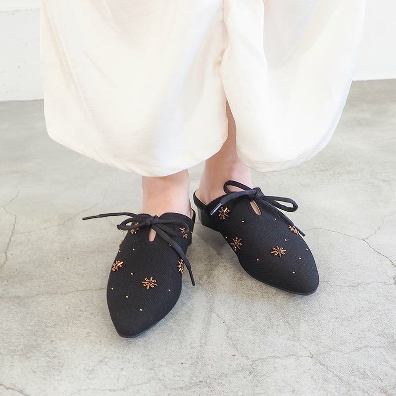 ビーズ刺繍とスタッズのメタル装飾が、エキゾチックで華やかなムードを醸し出すミュール。サテンの光沢をまとったリボンが目を引くポイントとなり、カジュアルさを抑えきれい目なスタイルへと導きます。