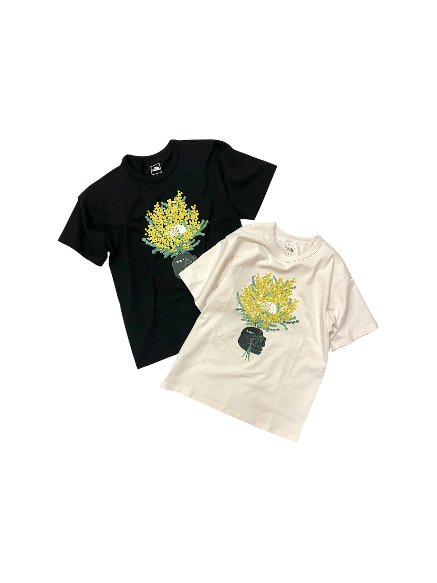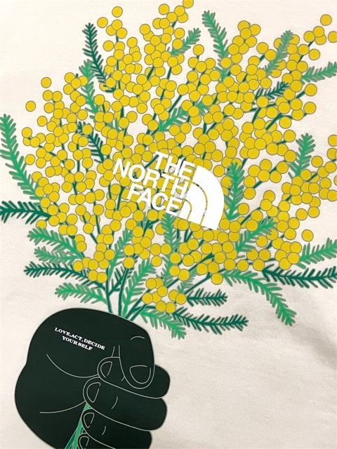 SRHRの認知向上に取り組むTHE NORTH FACEのグラフィックTシャツ。ミモザの花束を配したフロントプリントに風合いがよいコットンとポリエステルの混紡生地で、ユニセックスモデル。親子バインダー仕様で、赤ちゃんが襟元を引っ張っても伸びにくく、UVガード(UPF30-50+)機能付き。