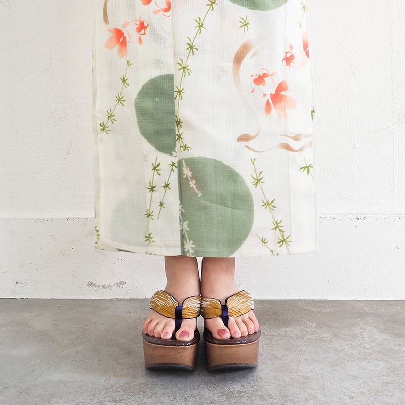 中底部分はツヤ感たっぷりのエナメルで漆塗り調に。また厚底ソールにはすっきりシックなウッド調ソールでうるさ過ぎないデザインとなっています。浴衣や和装だけでなく、いつもの私服にも似合う、幅広く使える一足です。