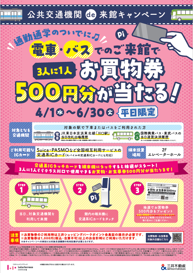 電車・バスでのご来館で3人に1人お買物券500円分が当たる!