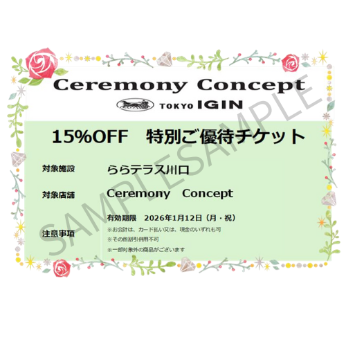期間中、セゾン受付カウンターにて三井ショッピングパークカード≪セゾン≫新規入会で ららテラス川口Ceremony Conceptでご利用頂けます15%OFFクーポンを進呈致します。