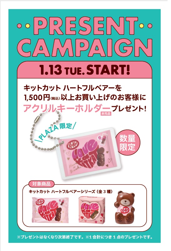 1/13発売予定です。 ¥1500(税込)以上 キットカットハートフルベアお買い上げの方に