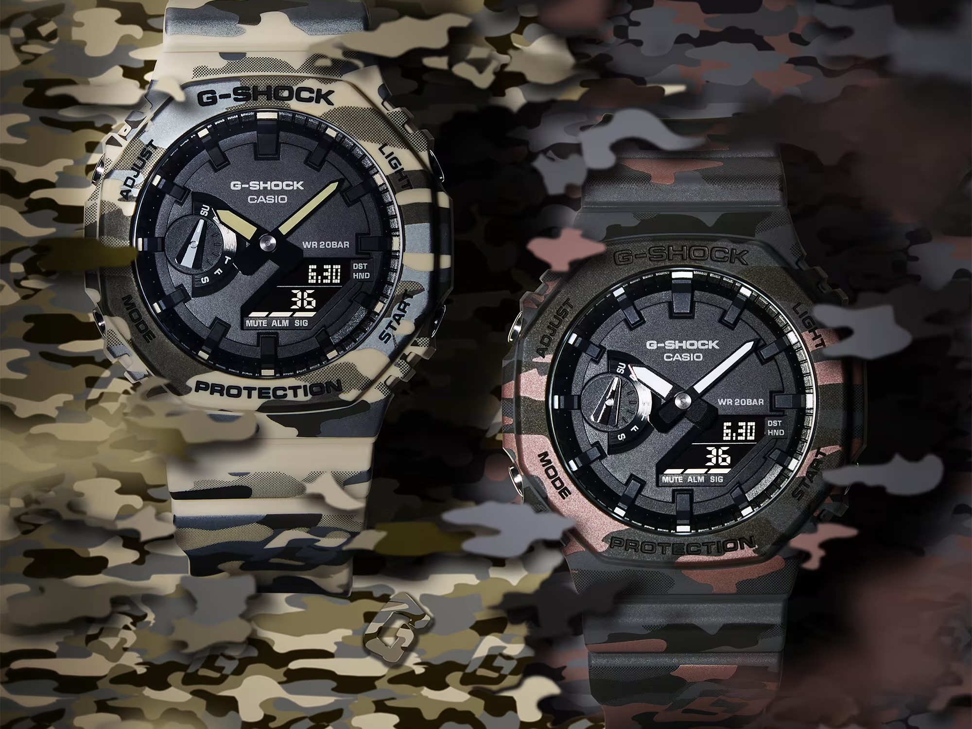 Gの文字を忍ばせたカモフラージュ柄とメタリックプリントが特徴。ダイヤルにもカモフラージュ柄を施したモデルも加わり、アウトドアから街使いまで幅広く楽しめます。