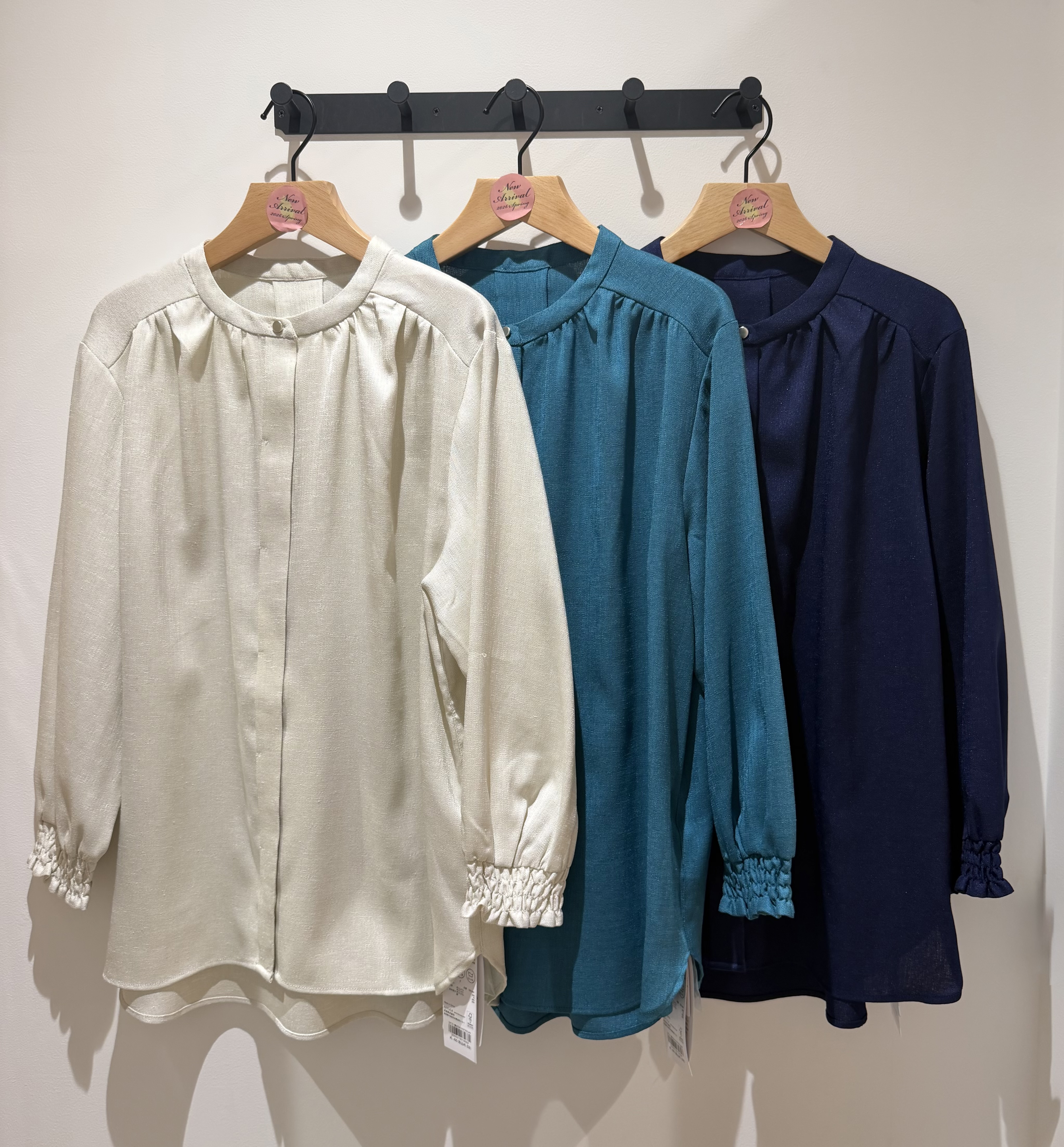 前あきのブラウスでゴールドのボタンがポイントで、顔周りにギャザーを施し華やかに‼︎