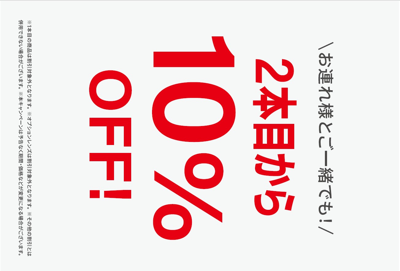家族、友人、カップルなどお連れ様同士の購入や、おひとり様で複数本の購入がお得になる2本目10%OFFキャンペーンを開催!トレンドのフレームや、オンオフ問わず使いやすいメタルフレーム、サングラスなど、今すぐ使えるアイテムをお得に手に入れるチャンス。