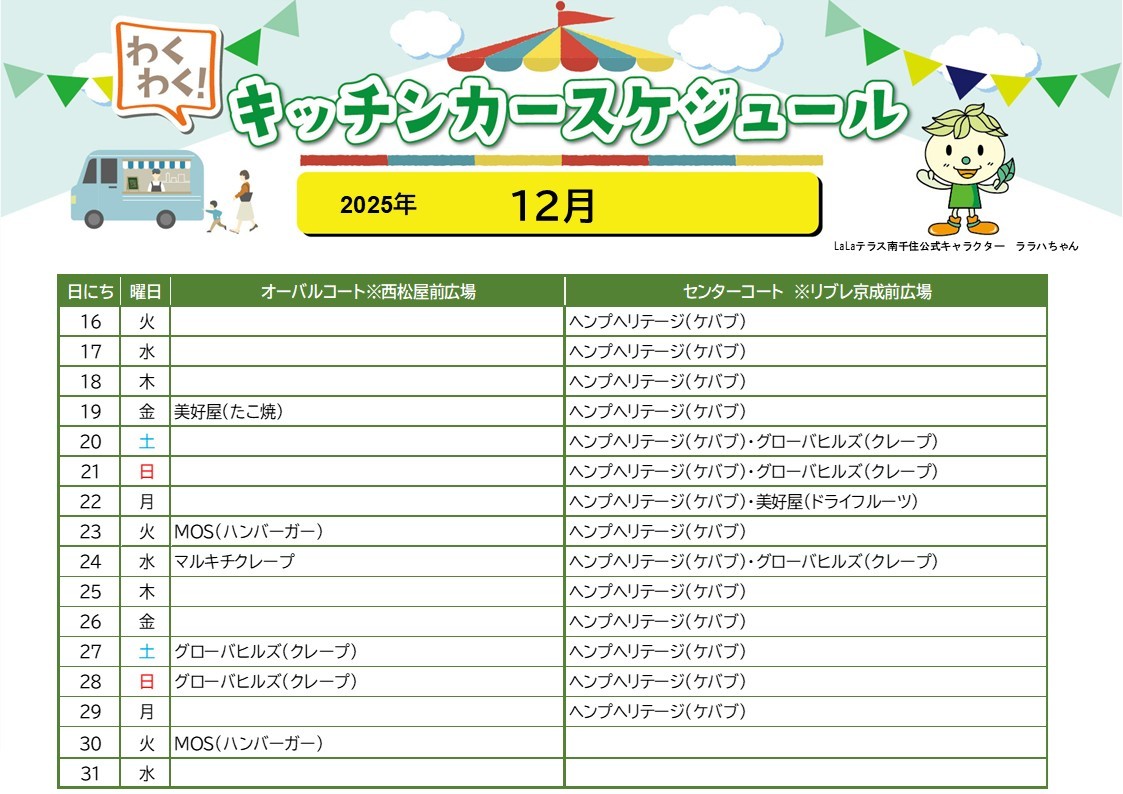 【LaLaテラス南千住】キッチンカースケジュール(12月後半)