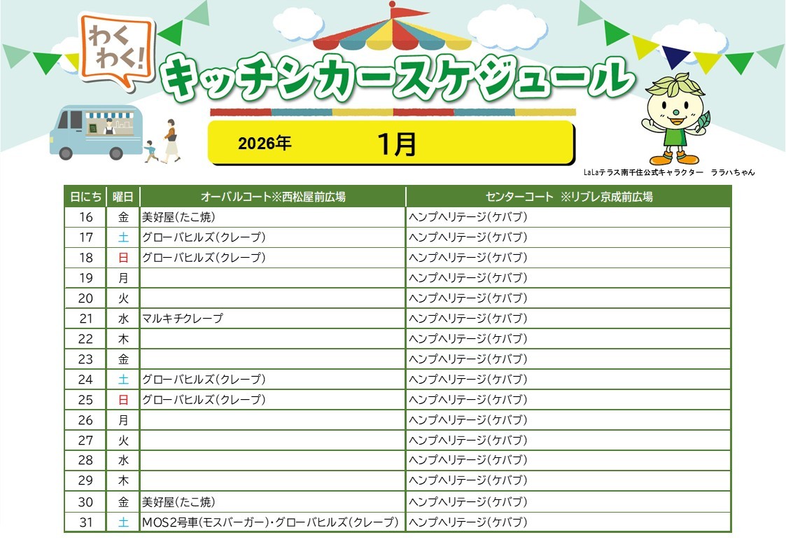 【LaLaテラス南千住】キッチンカースケジュール(1月後半)