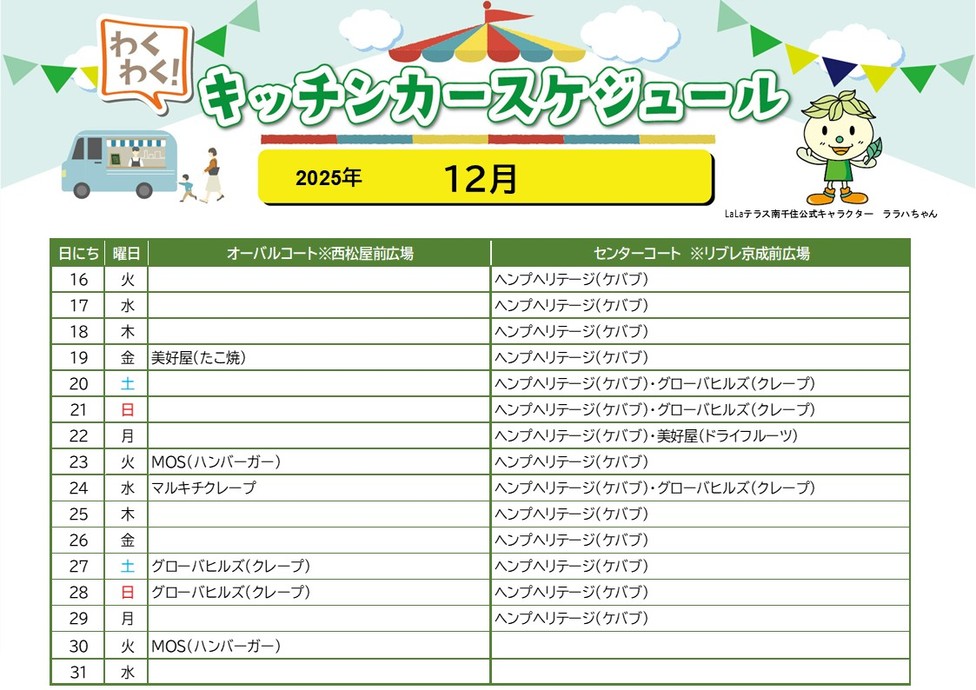 【LaLaテラス南千住】キッチンカースケジュール(12月後半)
