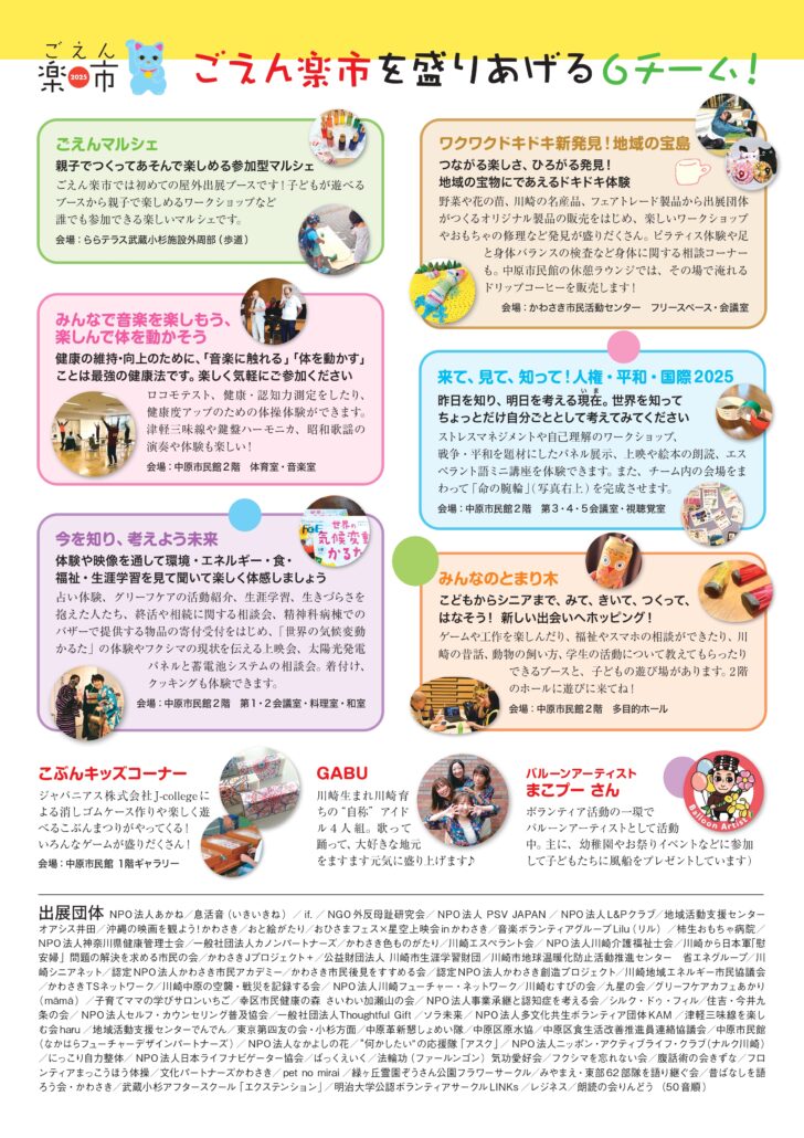 ららテラス武蔵小杉 地域連携の取り組み NEW Posted date:2026.3.20 ごえん楽市2025 2025/11/15(土)にららテラス 武蔵小杉公開空地にて、かわさき市民活動センター様主催「ごえん楽市2025」を開催しました。 ■イベント内容ごえん楽市は、川崎市内で活動する市民活動団体と出会える年1回の見本市です。67団体が参加して、活動紹介展示やワークショップ、パフォーマンス、相談など、多彩な企画を通じて活動を紹介します トップに戻る