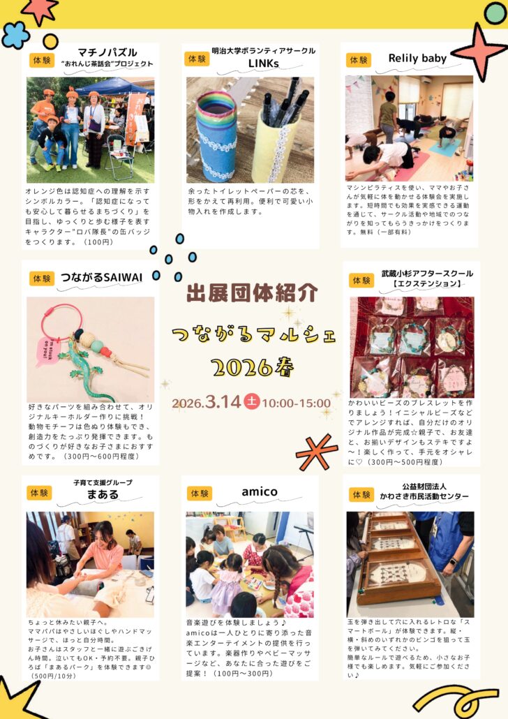 ららテラス武蔵小杉 地域連携の取り組み NEW Posted date:2026.3.20 つながるマルシェ 2026春 2026/3/14(土)にららテラス 武蔵小杉公開空地にて、かわさき市民活動センター様主催「つながるマルシェ 2026春」を開催しました。 ■イベント内容川崎市内を中心に活動するNPO団体が出展するイベント。体験やワークショップなどを通して、楽しみながら地域や環境について学べます! トップに戻る