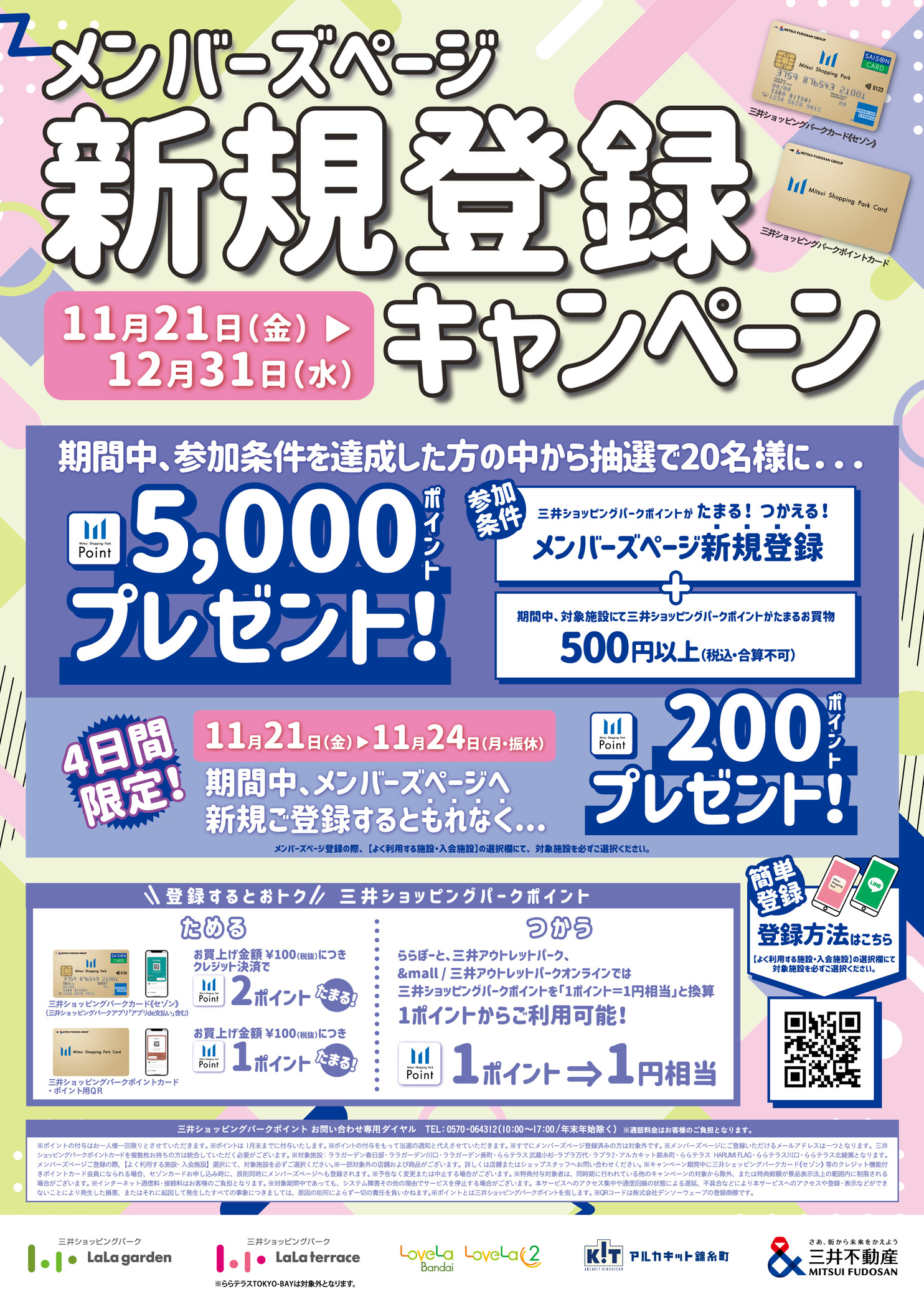 期間中、メンバーズページに初めてご登録いただき、対象施設で三井ショッピングパークポイントがたまるお買物を500円(税込・合算不可)以上していただくと、抽選で20名様に三井ショッピングパークポイントが当たります!(自動エントリー)