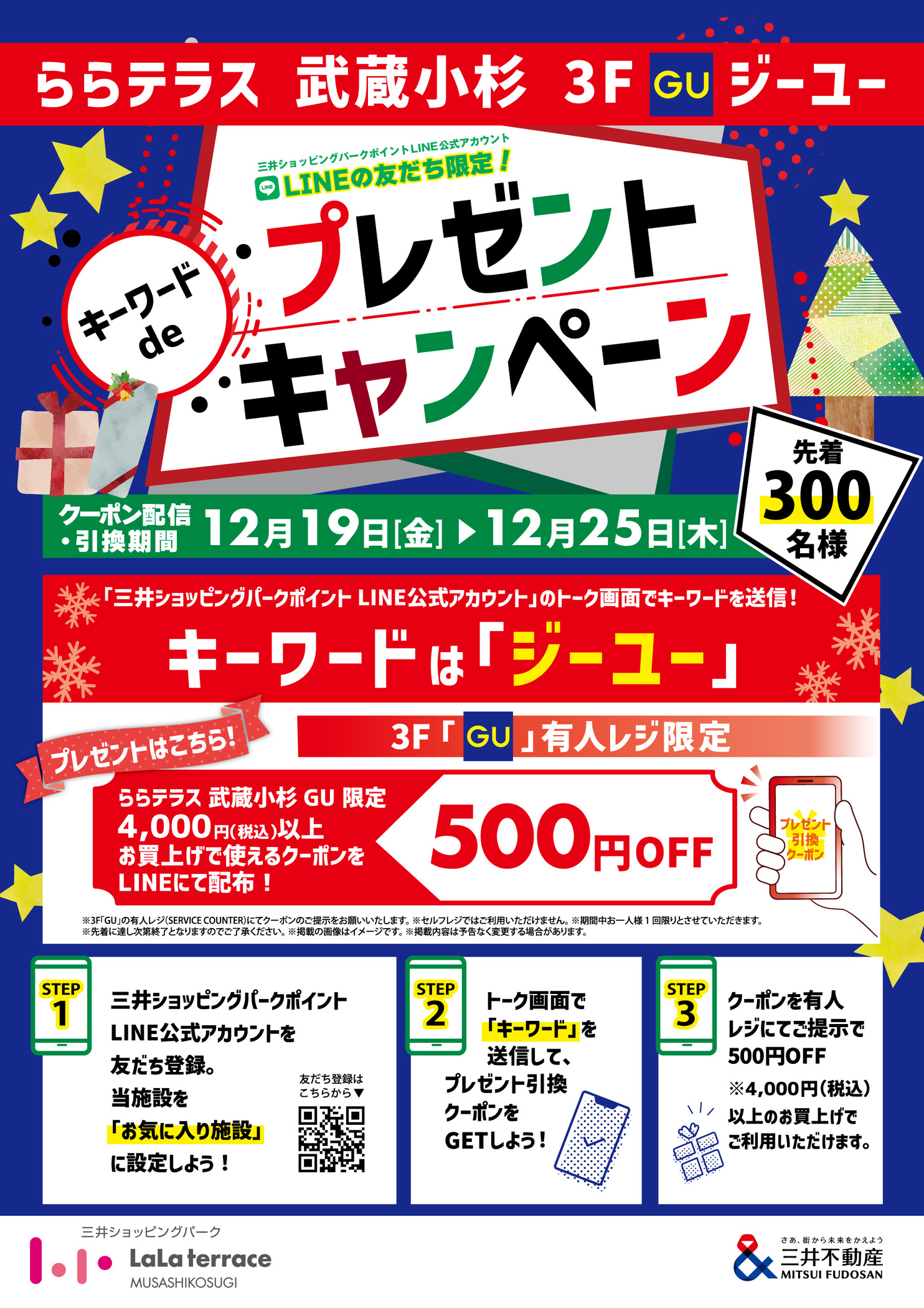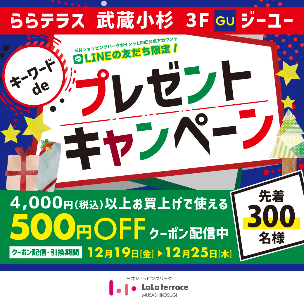 12/19(金)~12/25(木)の期間中、ららテラス 武蔵小杉【3F GU】で4,000円(税込)以上のお会計時に使える500円OFFクーポンを、先着で300名様にプレゼント!