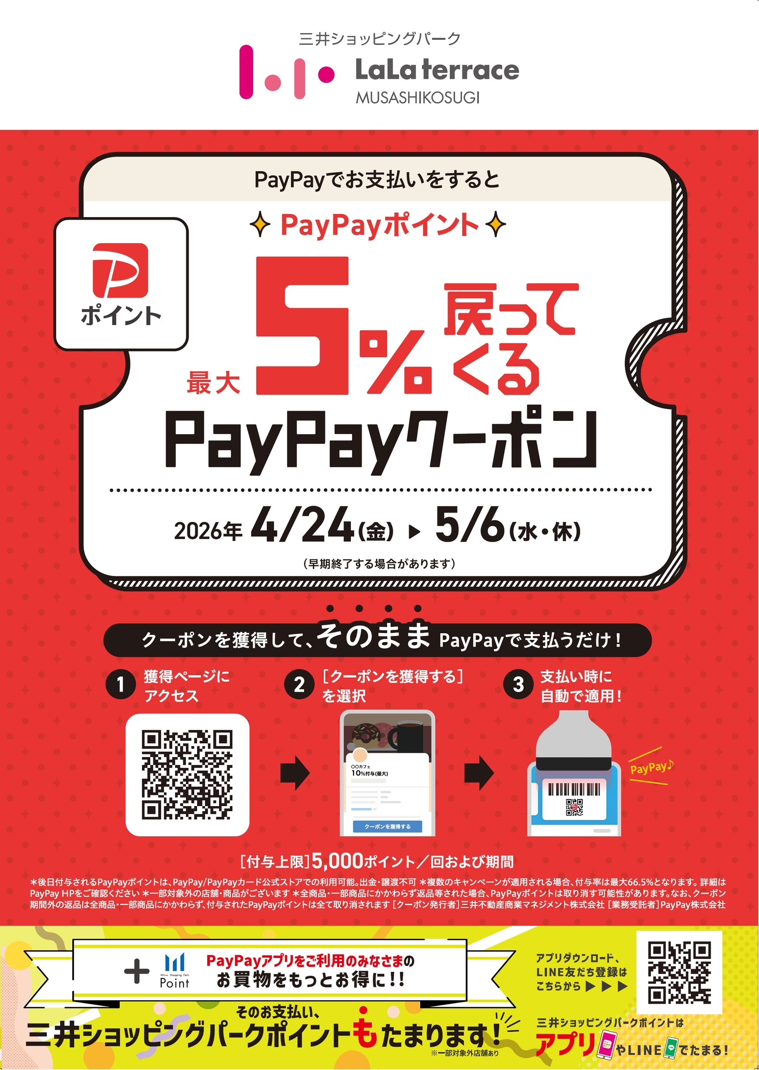 PayPayアプリで事前にクーポンを取得のうえ対象店舗にてPayPayでお支払いいただくと、最大5%分のPayPayポイントが後日付与されます。