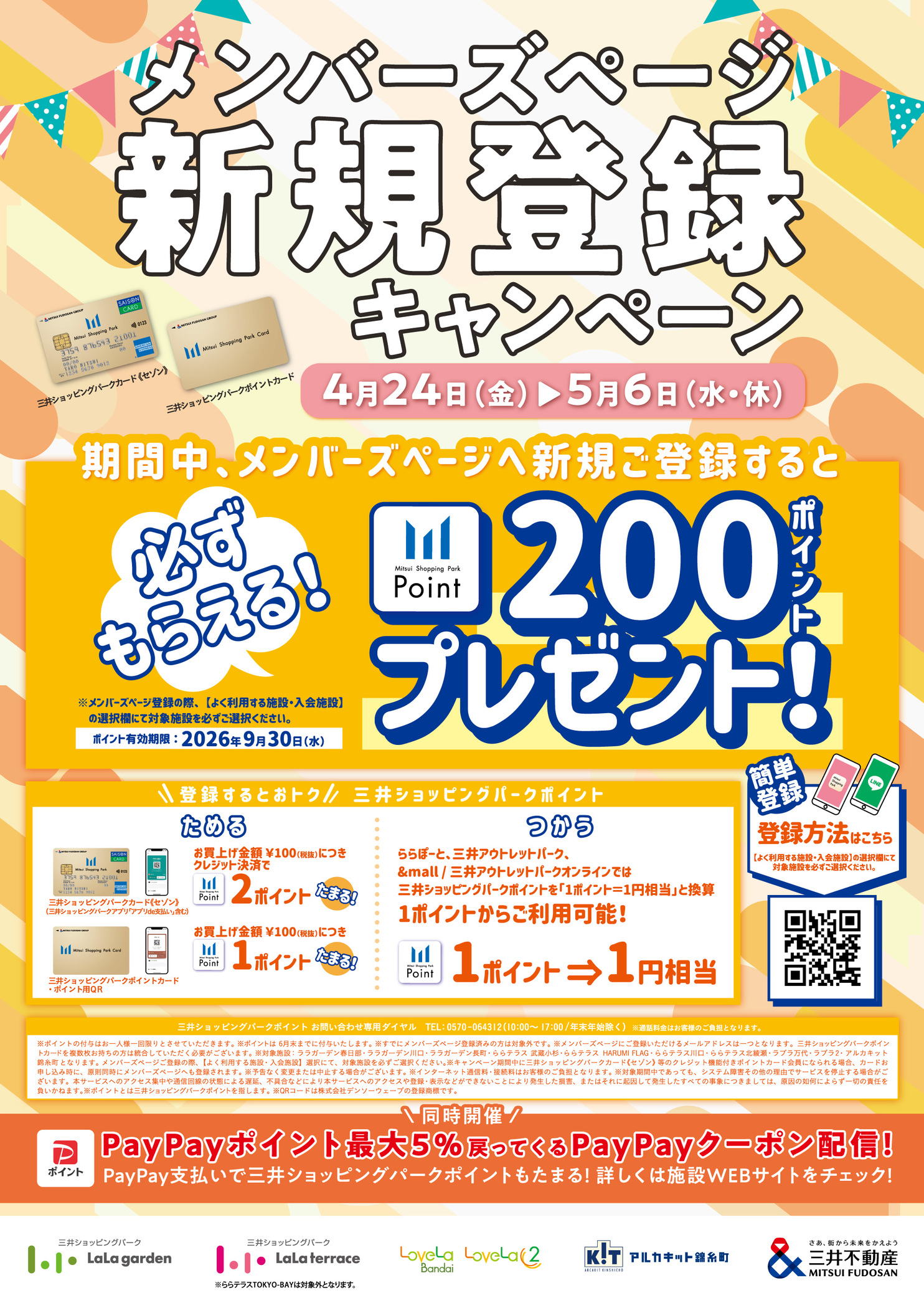 期間中、メンバーズページに初めてご登録いただくと、もれなく三井ショッピングパークポイント200ポイントをプレゼント!