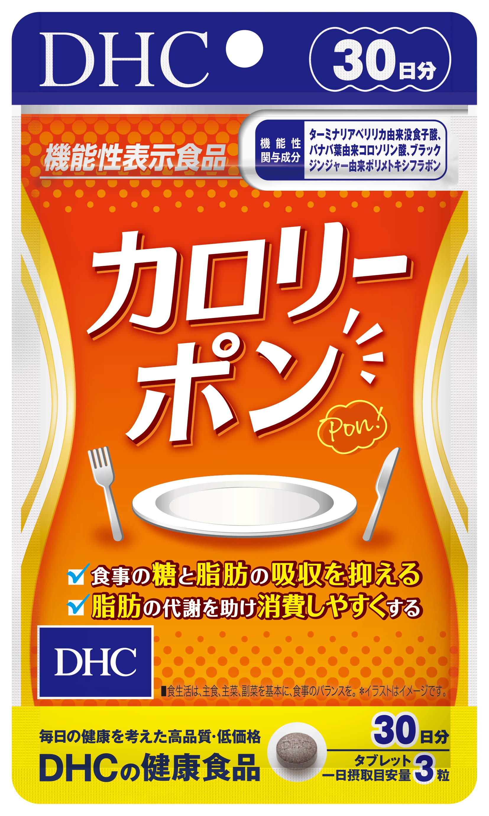 【届出表示】本品には、ターミナリアベリリカ由来没食子酸、バナバ葉由来コロソリン酸、ブラックジンジャー由来ポリメトキシフラボンが含まれます。ターミナリアベリリカ由来没食子酸、バナバ葉由来コロソリン酸は、食後の血糖値や中性脂肪値が上がりやすい方の、食事の糖と脂肪の吸収を抑える機能が報告されています。本品は糖と脂肪の多い食事をとりがちな方に適しています。ブラックジンジャー由来ポリメトキシフラボンは、脂肪の代謝を助け消費しやすくする機能が報告されています。