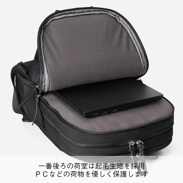 背面側の3つめの荷室はノートPCやタブレットも収納可能なクッション仕様で、起毛生地を採用しているので荷物をやさしく保護します。