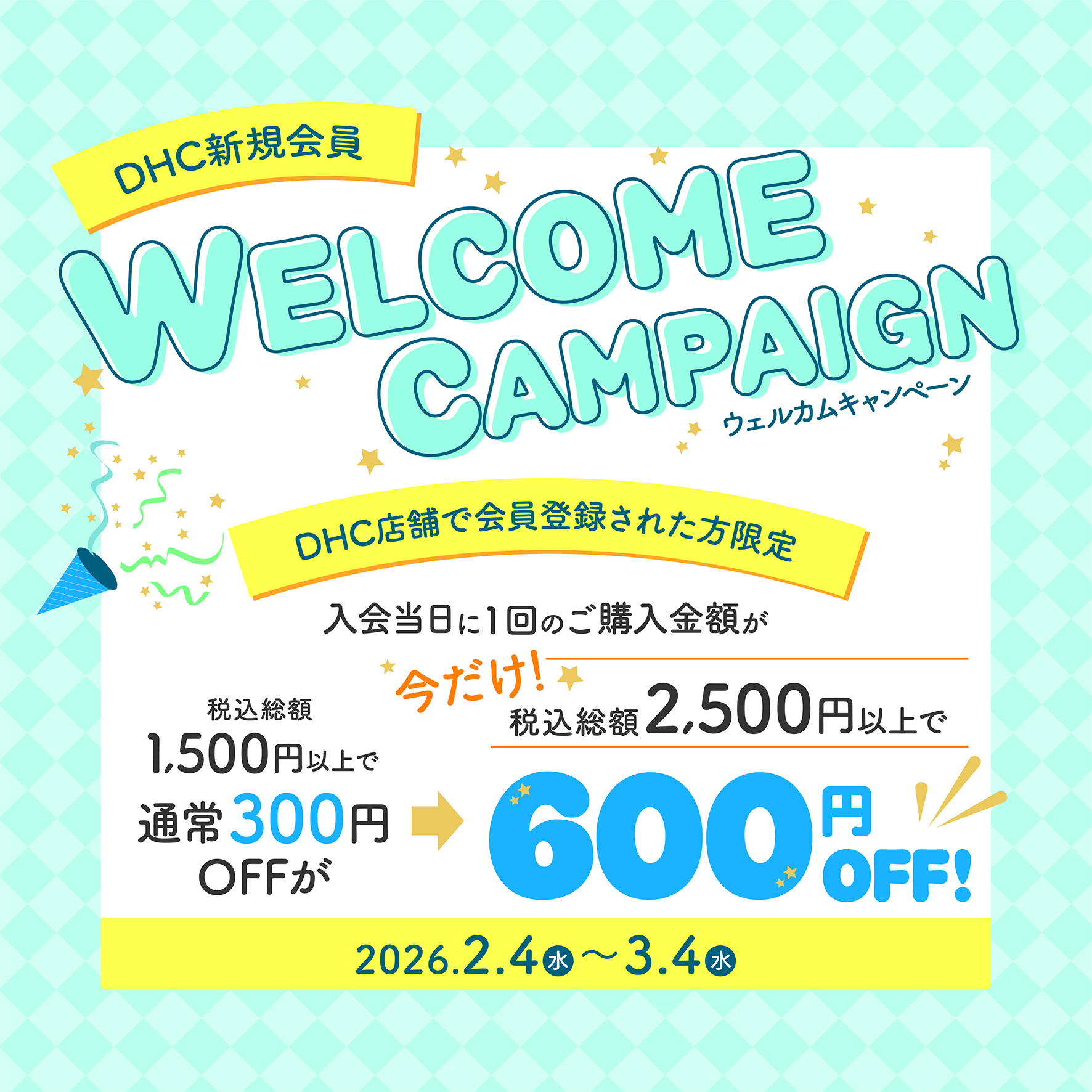 DHC店舗で会員登録された方限定!入会当日のご購入金額が2,500円(税込)以上で600円OFF!