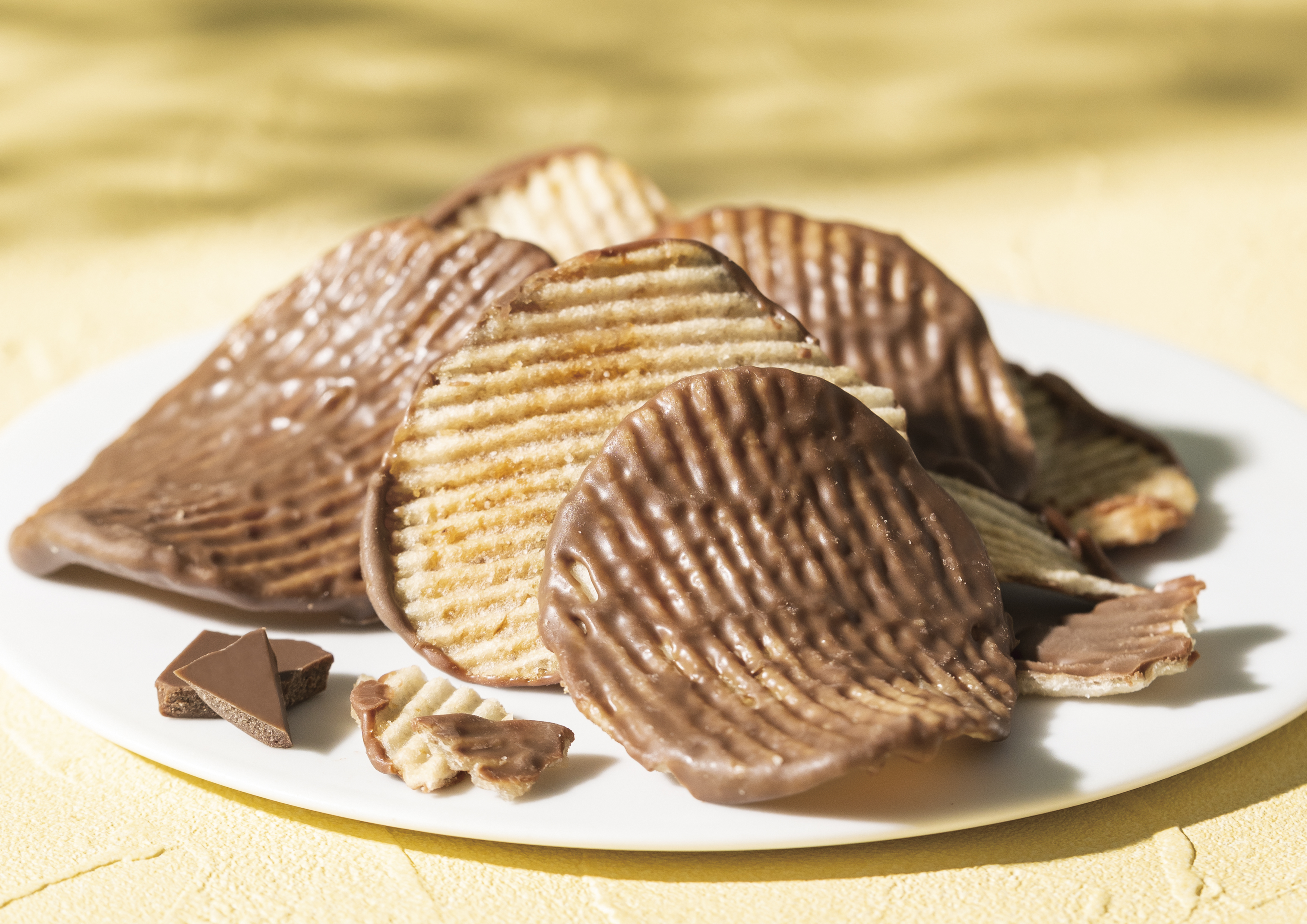 サクッとした食感のポテトチップスに、まろやかでミルキーなカカオ分31%ミルクチョコレートをコーティング。塩味と甘味の絶妙なバランスが、とまらない美味しさです。