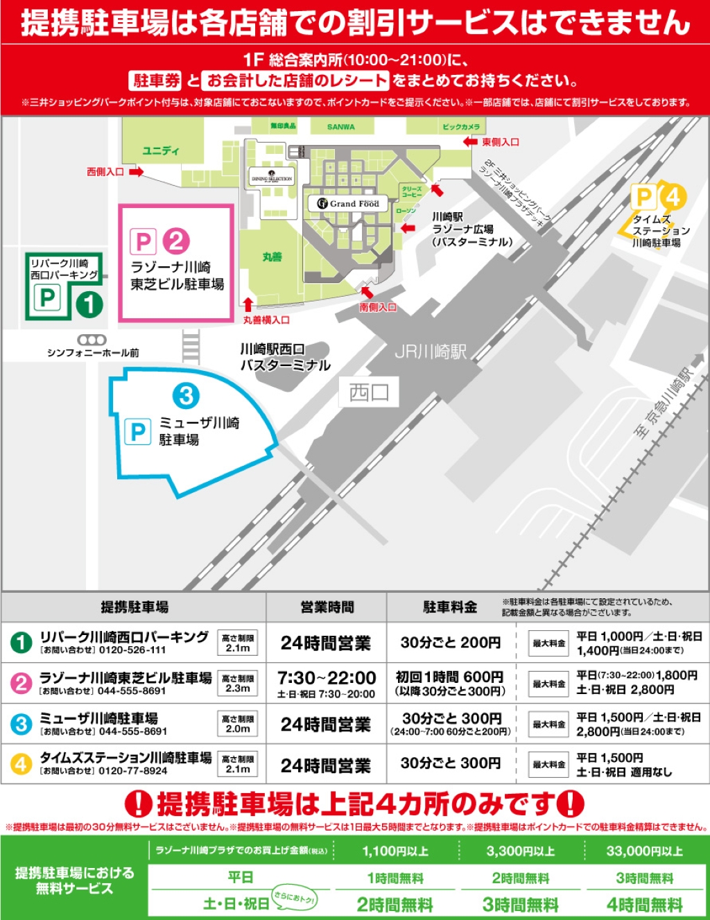 - ※ラゾーナ川崎プラザ(敷地内)のパーキング料金体系とサービス方法が異なりますのでご注意ください。