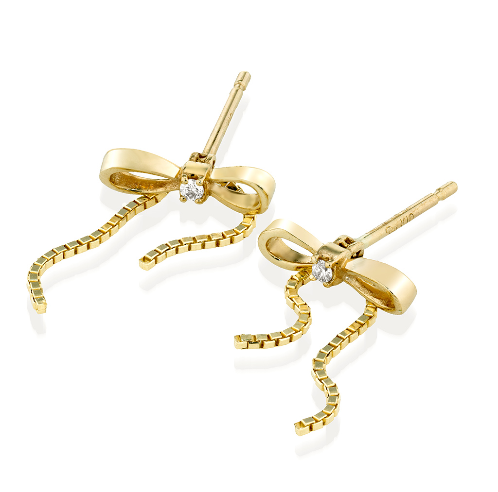 リボンの結び目にダイヤモンドが煌めき、アシンメトリーにデザインされたチェインが優雅に揺れます。