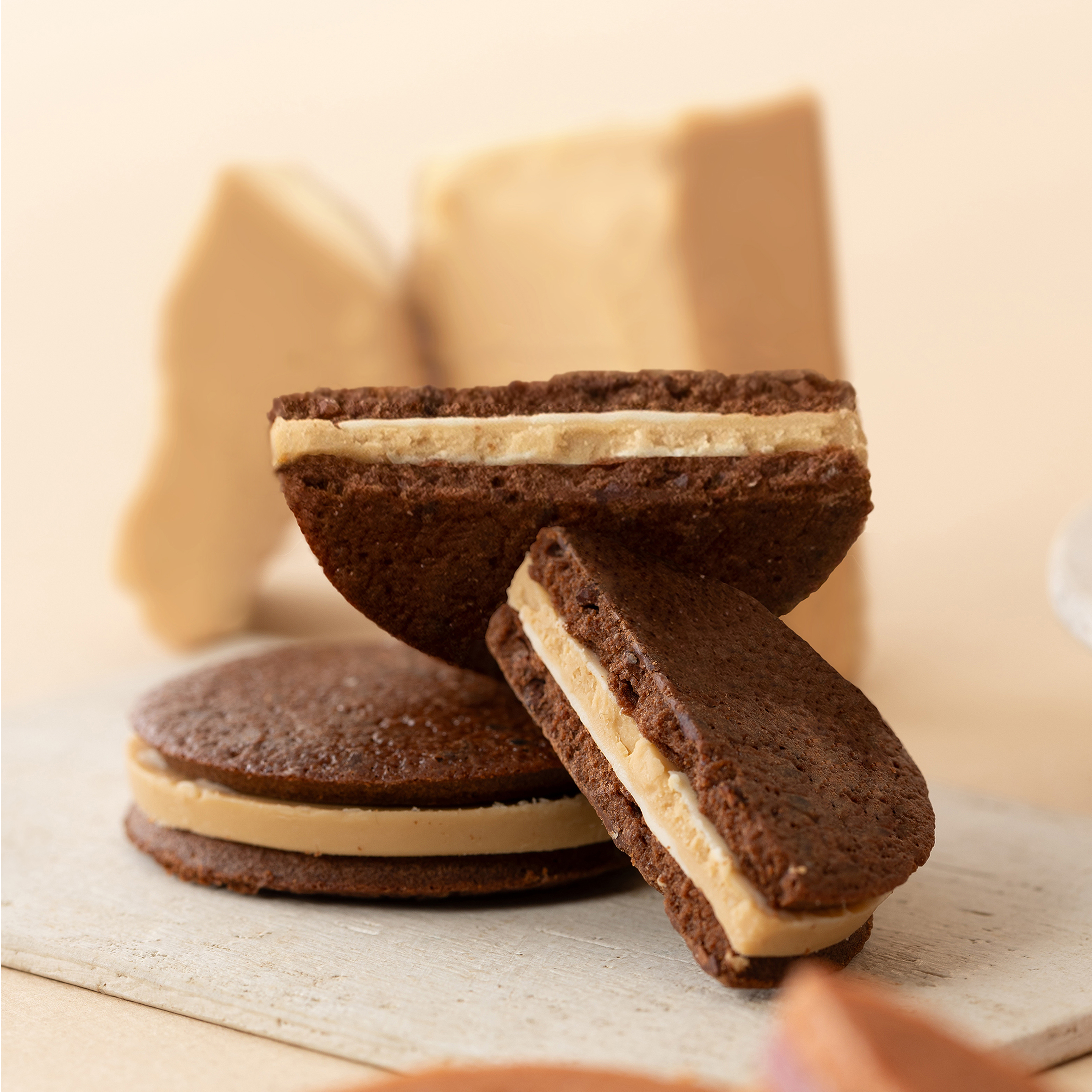 キャラメルのような香ばしい風味を感じるブロンドチョコレートに、アクセントとしてヨーグルトのような爽やかな酸味をプラス。カカオニブの食感が楽しいココアクッキーでサンド。
