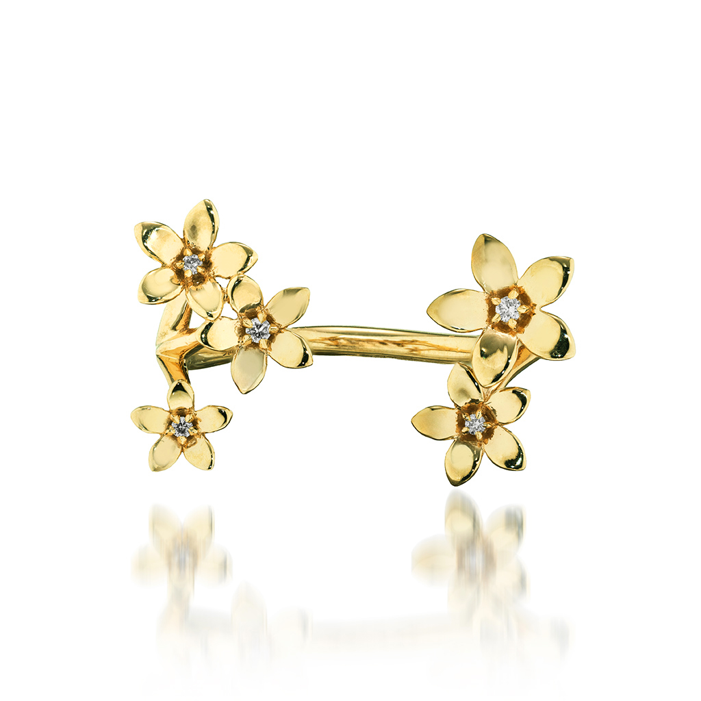 花の中心やその合間には、ダイヤモンドを「星留め」でセッティング。