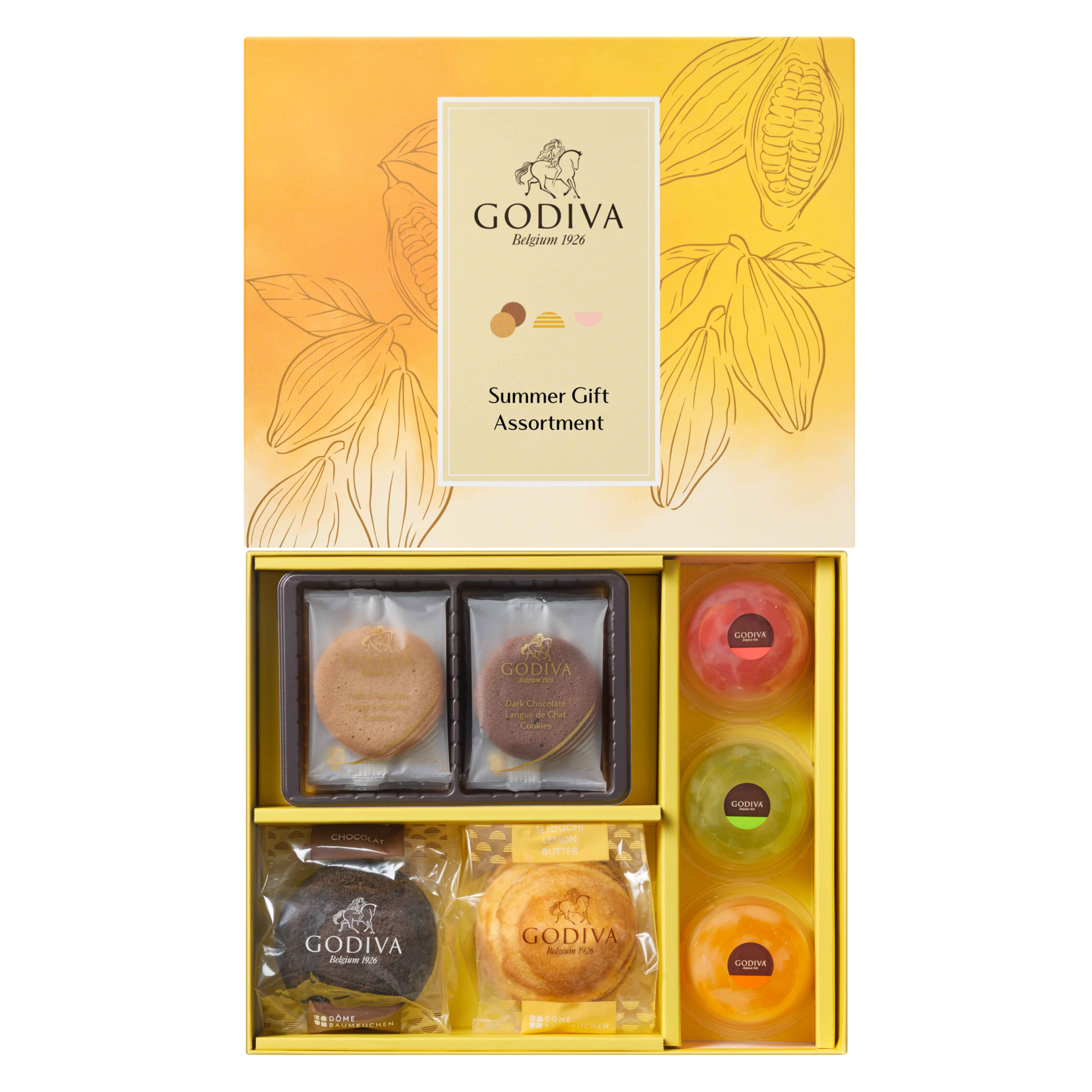 ゴディバで人気の「カカオフルーツ ジュレ」「ラングドシャクッキー」「ドームバームクーヘン」の3種を色とりどりにアソートしました。夏の爽やかさをグラデーションで表現した限定パッケージに詰め合わせました。