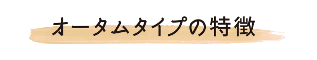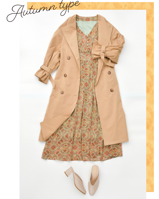 秋を感じさせるシックで落ち着いた色が得意なオータムさん。春夏の爽やかさが苦手ですが、柄物やゴールドアクセ、肌見せが得意!ポイントのワンピースにはシンプルな靴を合わせてバランスをとりましょう。