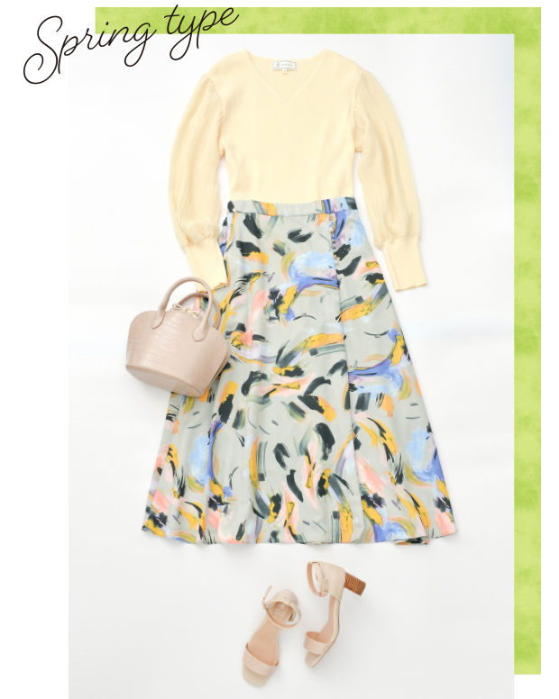 華やか&鮮やかな春色やフェミニンな甘コーデが得意なスプリングさん。可愛さを残しつつ、リブニットですっきり&スカートの長めの丈感なら大人っぽい着こなしに。靴や鞄に明るいピンク系orグリーン系を合わせてもGood!