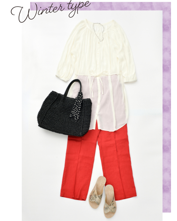 かっちりとした素材を得意とするウィンターさんでも、得意な色と存在感のあるシルバーアクセを組み合わせることで、柔らかなブラウスもステキに着こなせます。休日のカジュアルスタイルの参考に♪