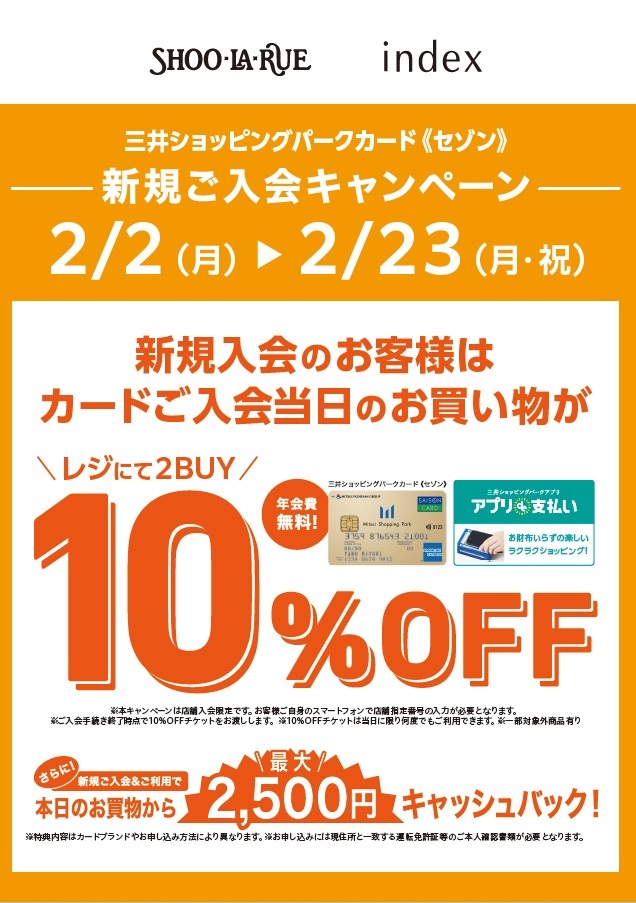 2/2(月)~2/23(月・祝)の期間中、「Index」、「SHOO-LA-RUE」にて、三井ショッピングパークカード《セゾン》に新規ご入会されたお客様へ、当日使える2BUY 10%OFFチケットをプレゼントいたします。