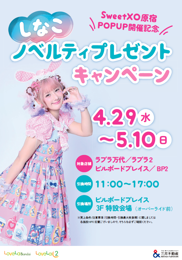 ラブラ万代・ラブラ2・ビルボードプレイス・BP2いずれかの対象施設にて、期間中に2,000円(税込)以上ご購入いただいた当日のレシートを、ビルボードプレイス3F特設会場(オーバーライド前)へお持ちいただくと、このキャンペーンでしか手に入らない《しなこステッカー》を1枚プレゼント❤
