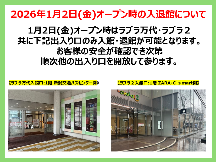 お客様の安全確保のため、1/2(金)オープン時はブラ万代・ラブラ2共に入館口・退館口を一時的に制限いたします。